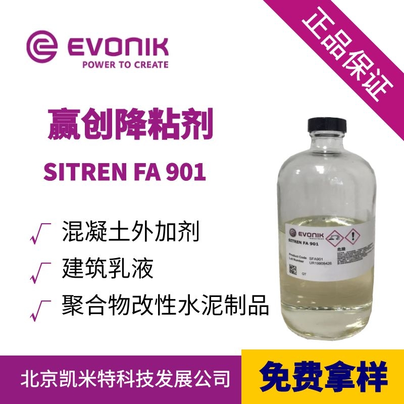 混凝土降粘剂SITREN® FA 901是一款非离子型表面活性剂复合物,其动态表面张力极低,具有快速渗透润湿的特点,因此能够在短时间迅速渗透、吸附至固液、液液、液气界面,有效降低其应用配方体系(尤其是有机、无机复合体系)内部分散相与体相之间的界面能和界面张力,提高体系的相容性、分散性、均匀性和稳定性。
